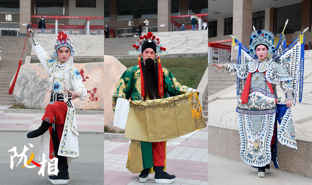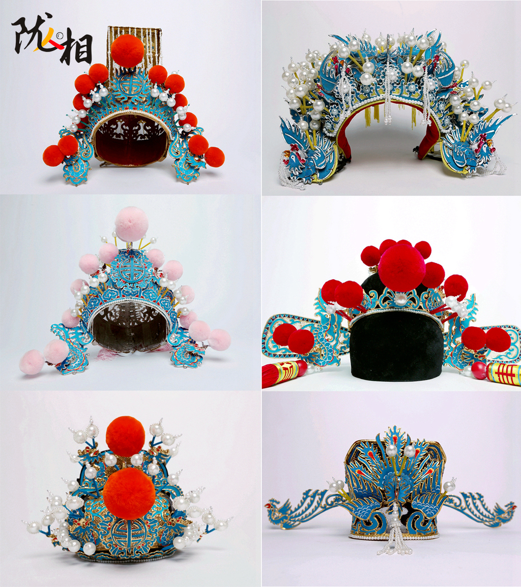 戏曲专业的学生戴着金龙同学制作的盔头扮演不同的角色(拼版图片)