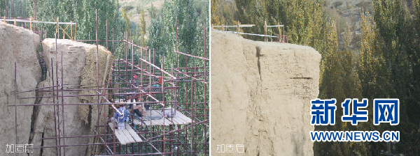 敦煌研究院古代壁画与土遗址保护创新团队承接的新疆交河故城崖体加固项目前后效果对比(资料图)。敦煌研究院供图