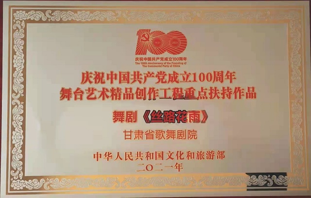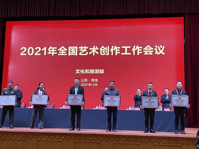 12月18日,文化和旅游部在山东省青岛市召开的“2021年全国艺术创作工作会议”上,发布了“庆祝中国共产党成立100周年舞台艺术精品创作工程”入选名单,颁发了“庆祝中国共产党成立100周年舞台艺术精品创作工程奖牌”。甘肃省文化和旅游厅遴选推荐的舞剧《丝路花雨》《大梦敦煌》《彩虹之路》、陇剧《官鹅情歌》、小品《你笑起来真好看》等5部舞台艺术精品,经文旅部评审正式入选“舞台艺术精品创作工程重点扶持作品”。甘肃省歌舞剧院创排的舞剧《丝路花雨》作为12家“百年百部”工程受奖单位在全国艺术创作工作会议上接受奖牌和荣誉证书,甘肃省文旅厅、山东省文旅厅等参会代表12家领奖单位上台领奖,充分展现了文旅部对甘肃省入选作品质量及组织工作的高度肯定。