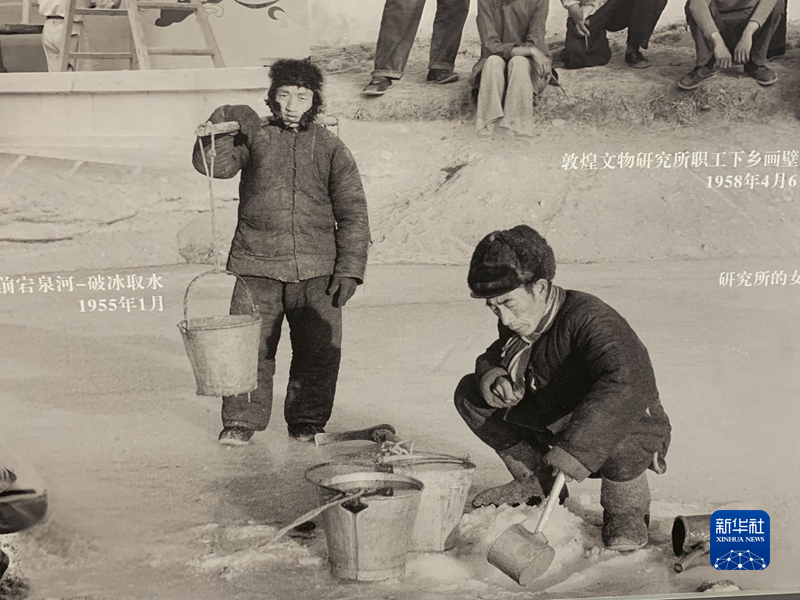 展览的第二部分,主要呈现1944年“国立敦煌艺术研究所”成立后,几代文化工作者扎根大漠、开拓进取的历程。该部分展出了大量老照片,如上世纪五六十年代,文化工作者破冰取水、耕作劳动的场景。