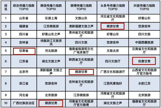 1月16日,文旅产业指数实验室发布2021年12月全国省级文化和旅游新媒体传播力指数报告,甘肃省位居全国综合传播力指数排名第5,“微游甘肃”新媒体矩阵的四个单项全部进入top10榜单,其中“微游甘肃”头条号传播力指数位居全国第2、微博传播力指数第7、微信公众号传播力指数位居全国第10、“如意甘肃”抖音传播力指数位居全国第6。