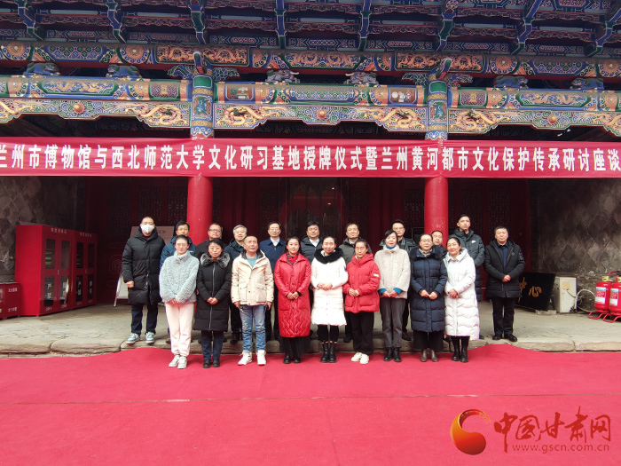 中国甘肃网1月21讯 (本网记者 张兰琴)21日下午,兰州市博物馆与西北师范大学联合建立“兰州黄河都市文化保护传承研习基地”授牌签约仪式在兰州市博物馆举行,随后举行兰州黄河都市文化保护传承研讨座谈会。此举旨在进一步推动兰州市高校学生社会实践和博物馆学术研究工作。