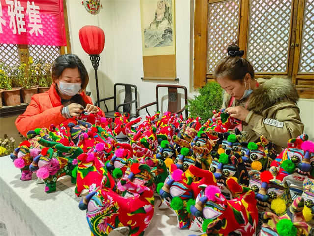 庆阳香包绣制非遗扶贫就业工坊的“绣娘”们制作新年“虎”元素香包 刘兰芳 摄