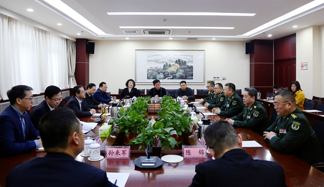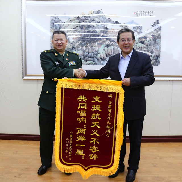 1月25日,时值传统佳节小年,酒泉卫星发射中心副政委、少将朱大雄一行,来到省文旅厅进行走访慰问。在热烈友好的氛围中,省文旅厅党组书记、厅长陈卫中与酒泉卫星发射中心副政委、少将朱大雄一行就组歌《“两弹一星”——江山民心》创作演出等事宜进行了座谈交流,军地领导畅谈鱼水情深,共贺取得成就,互致新春祝福。