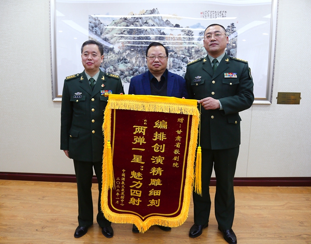 座谈会上,朱大雄代表酒泉卫星发射中心向甘肃省文旅厅赠送了“支援航天义不容辞、共同唱响‘两弹一星’”的感谢锦旗。陈卫中向酒泉卫星发射中心回赠了新中国成立七十周年甘肃彩车模型。酒泉卫星发射中心社会服务部部长、大校权开智向甘肃省歌剧院赠送了锦旗。