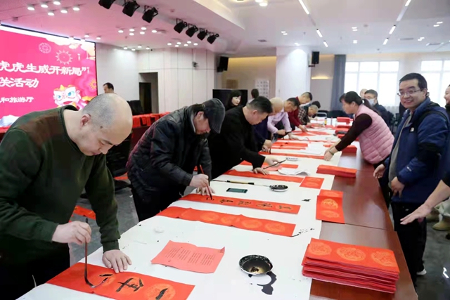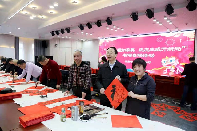 金虎送福如添翼,虎虎生威开新局。在传统农历虎年春节即将到来之际,为了营造欢乐祥和的节日氛围,弘扬中华传统文化,1月25日,省文旅厅直机关党委组织甘肃画院和甘肃省文化馆的书法家开展了迎新春写春联送福字活动,为厅机关干部职工、社区人员写春联、送福字。活动共送出春联、“福”字600余副,使大家在传统文化韵味中感受芬芳年味,感受中华文化魅力。