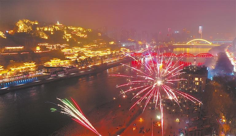 2月15日是元宵佳节,黄河岸边璀璨的烟花耀眼夺目,兰州市民纷纷走出家门闹元宵,感受浓浓的节日氛围。 新甘肃·甘肃日报记者 盛学卿 摄