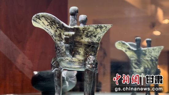 图为酒泉夜光杯厂里陈列的夜光杯茶艺文化产品——精品悬环玉壶。王牧雨