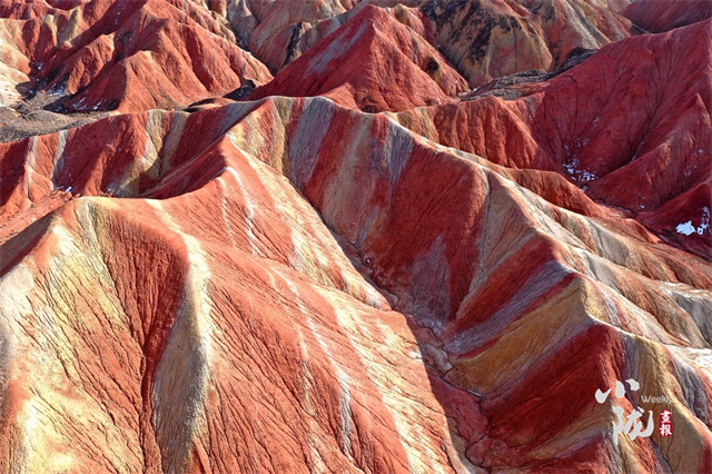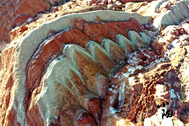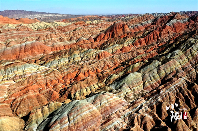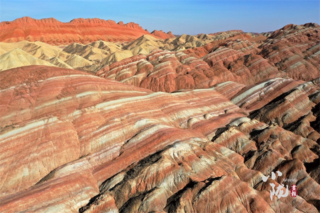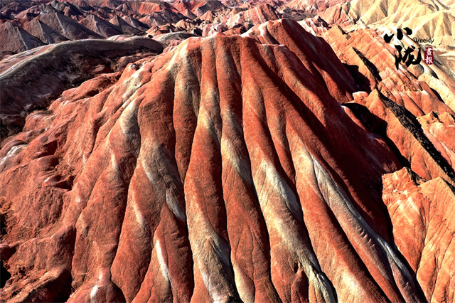 张掖七彩丹霞是一个宏观、微观都很美的地方,凑近感受,明艳的色彩就在眼前。空中俯瞰,沟壑纵横中勾勒大地脊梁,绵延不觉中为大地布下七彩画布。