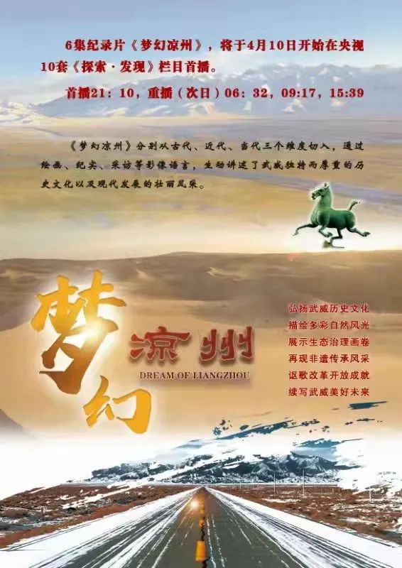 为加快推进武威市文化旅游名市建设,由北京伯璟文化传播有限公司拍摄制作的六集纪录片《梦幻凉州》,将于4月10日起在中央电视台科教频道《探索·发现》栏目播出。