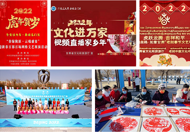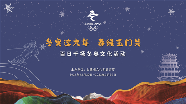 为深入贯彻习近平总书记关于冬奥会系列重要批示、指示精神,认真落实北京冬奥会文化活动工作协调小组安排部署,甘肃省文旅厅从2021年12月20日起,在全省范围内通过线上与线下同步开展了“冬奥过大年 春绿玉门关”百日千场冬奥文化活动,活动于2022年3月31日圆满收官。活动期间,共开展冬奥文化广场和冬奥社区重点场所文化活动100多场、群众性文化活动3990多场、文艺活动700多场、非遗展演200多场、冬春旅游(冰雪)活动1000多项、文博活动300多场,并与五大洲的30多国“云”聚共贺中国年,为全世界人民群众奉上了精彩独特的文化盛宴,全方位宣传展示了中华优秀传统文化和冬奥文化,充分展现了甘肃的历史之美、山河之美、文化之美。
