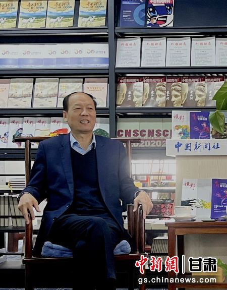 兰州大学主办《视野》总编辑包国宪做客中新社甘肃分社接受专访。 九美旦增 摄
