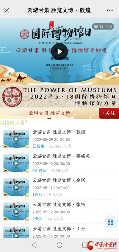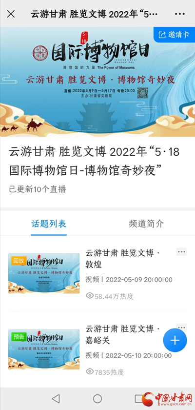 中国甘肃网5月10日讯 (本网记者 张兰琴)为迎接2022年“5·18国际博物馆日”,甘肃省文物局组织省、市、县三级博物馆联合推出“云游甘肃 胜览文博·博物馆奇妙夜”系列直播活动。直播于5月9日至17日每日20:00上线,9日晚进行的“敦煌市博物馆之夜”迎来58.44万人次的访问量。接下来,甘肃各地博物馆将轮番上演神秘的博物馆奇妙夜。