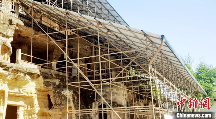 在北石窟寺,多体量多结构脚手架支撑起保护棚,窟龛轮廓若隐若现。崔惠萍介绍说,该防水工程,属于实验性,于2021年3月建成,能最大程度覆盖遮挡崖体,保护崖面窟龛,防止雨水对石窟的冲蚀破坏。
