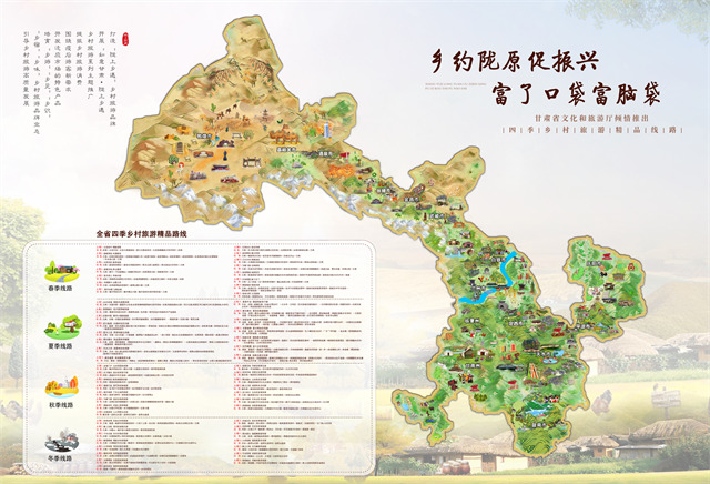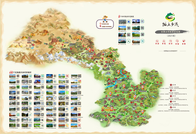 为推介甘肃省乡村旅游资源,讲好乡村旅游故事,甘肃省文化和旅游厅适时设计印发甘肃乡村旅游手绘图(2021版),手绘图以“相约陇原促振兴·富了口袋富脑袋”为主题,突出“图文并茂、服务游客、便于携带、适于珍藏”等特点,对2021年创建的8个乡村旅游示范县,60个文旅振兴乡村样板村全部开发设计了电子“二维码”,设置了甘肃省乡村旅游60条四季精品线路,以亮丽、活泼的色彩和卡通的形式生动形象地展现了甘肃乡村旅游特色元素和资源产品信息,对于帮助游客畅游甘肃乡村、感知陇原文化、体验乡村魅力具有重要意义。