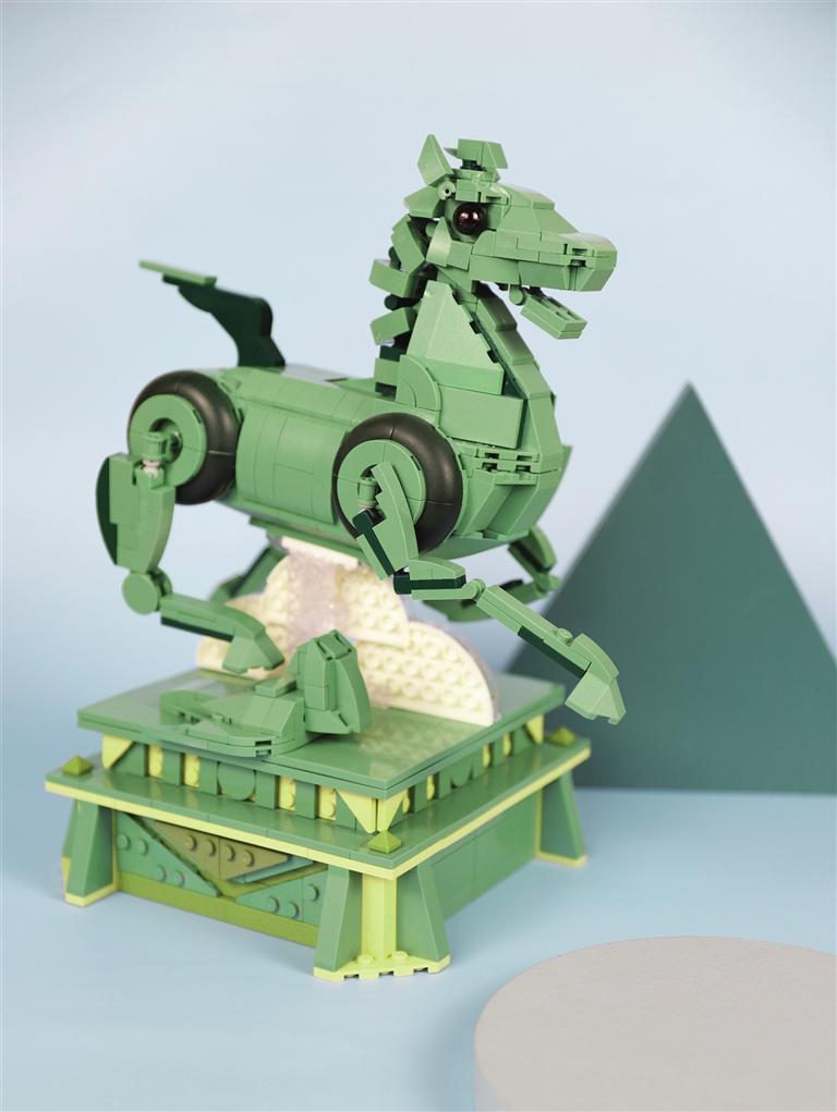 随着越来越多网友在社交平台上曝光 “铜奔马”的正面照,让更多人看到了它呆萌可爱的一面,大家纷纷表示“被萌到了”。甘肃省博物馆文创中心抓住铜奔马正面自带喜感的特点,在尊重文物原型特点的基础上,打磨每一处表情细节,设计出这款3D马头造型的铜奔马文创衍生产品——“绿马头套”,并创意编排了一组 “神马舞”同步亮相,受到了一大批年轻观众的喜欢。还有,社交平台上的铜奔马系列表情包,以个性活泼、诙谐幽默的趣味形象,在人们日常的聊天中火热传播。今年全新打造的铜奔马立体拼装积木、“一马当先”、“马到成功”铜奔马系列毛绒玩具和“绿马飞侠”风筝 将在6月11日“博物馆之夜”举行新品发布会。