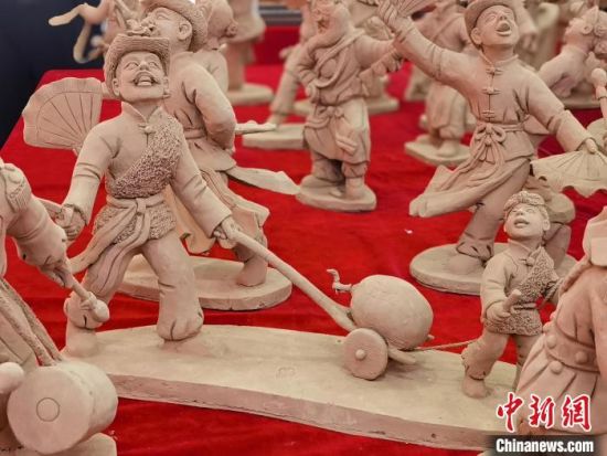 泥塑群雕展示了近百位农民闹社火、舞河州秧歌的场景,农民手持农具、载歌载舞,表情动作千姿百态。 闫姣 摄
