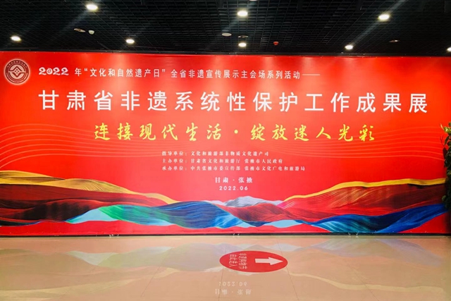 6月11日是今年的“文化和自然遗产日”。为充分展示全省非物质文化遗产(以下简称“非遗”)系统性保护工作成果,体现非遗保护为了人民、保护成果人民共享的理念。6月8日至11日,甘肃省文化和旅游厅、张掖市人民政府共同在张掖丝绸之路艺术中心举办2022年“文化和自然遗产日”甘肃省非遗宣传展示主会场系列活动,期间,作为本次系列活动重点版块内容的甘肃省非遗系统性保护工作成果展闪耀彩虹张掖,广受媒体及观众赞誉。