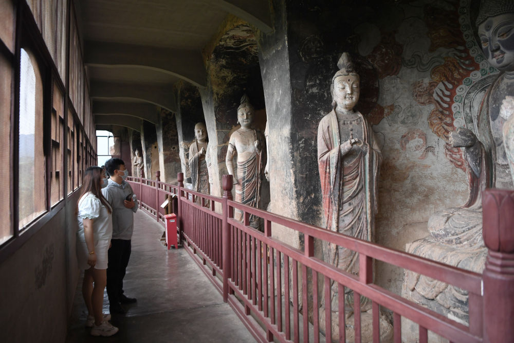 游客在麦积山石窟第9窟参观(6月9日摄)。新华社记者陈斌摄