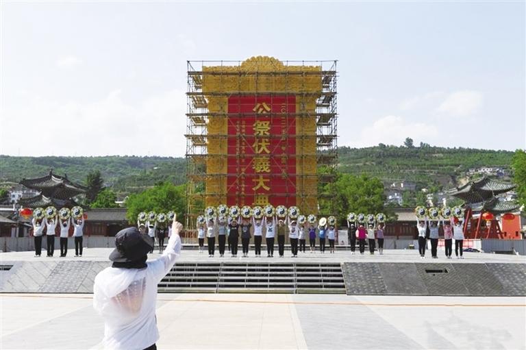 6月14日,记者在天水市伏羲庙广场看到,2022年公祭伏羲大典《乐舞告祭》在伏羲广场祭坛进行冲刺排练,将于6月22日正式演出。