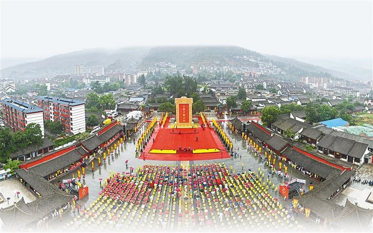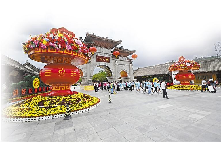 伏羲庙广场上,来自五湖四海的嘉宾代表身穿深色服装,佩带黄色绶带肃然而立。这里,一场盛大的祭拜大典即将开启。
