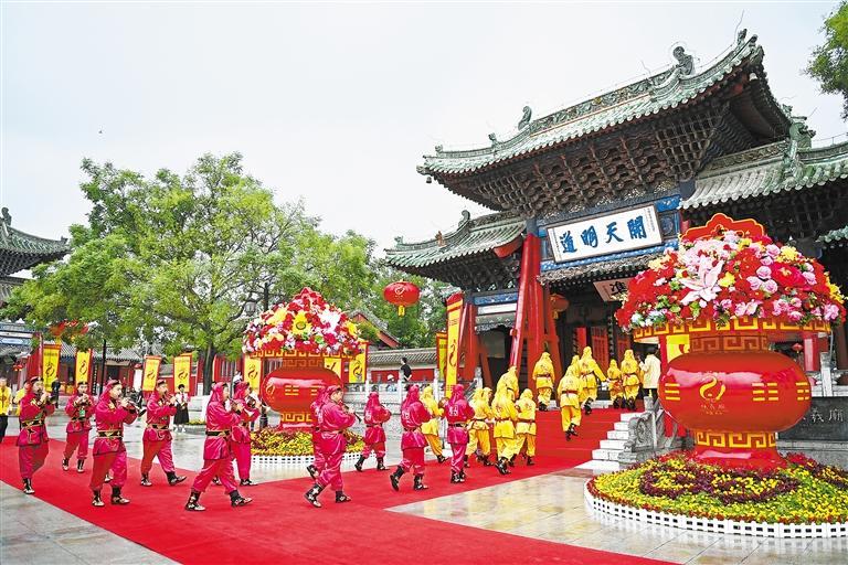 击鼓鸣钟、恭读祭文、鞠躬敬祭、乐舞告祭、敬献花篮、谒庙拜祖,来自五湖四海的嘉宾代表以太牢、鲜花、雅乐之仪和虔敬之心,致祭中华人文始祖太昊伏羲。