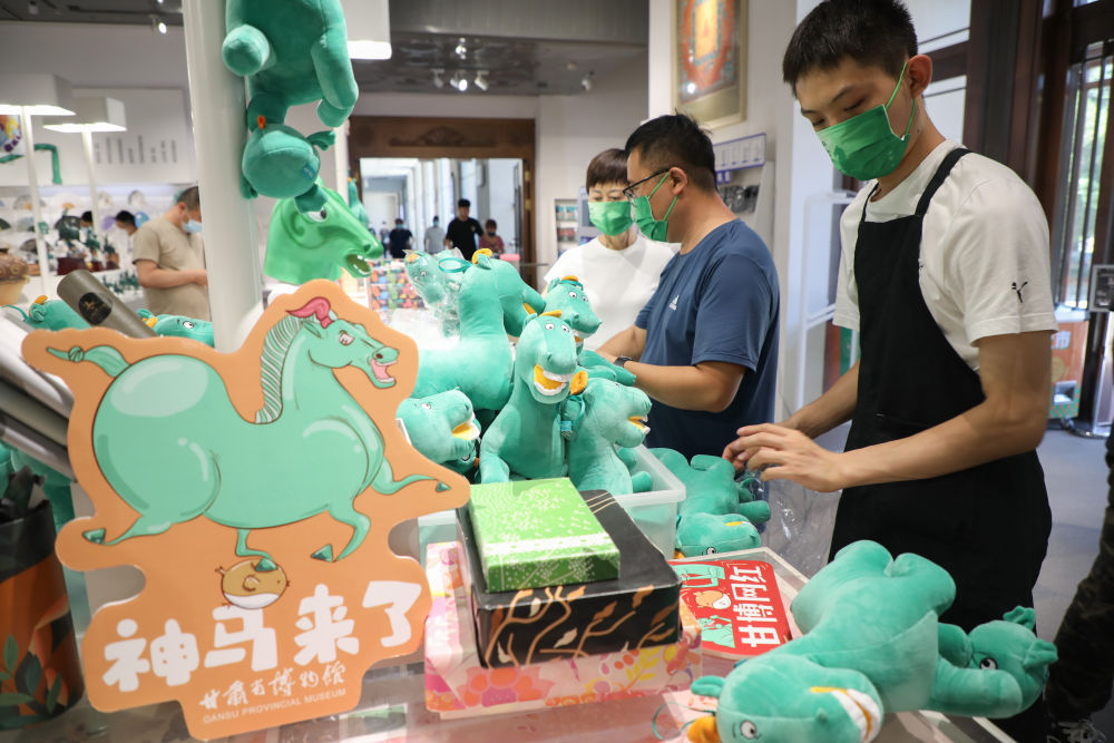 6月28日,在甘肃省博物馆文创商店,工作人员摆放“马踏飞燕”主题玩偶。(新华社记者 马希平 摄)