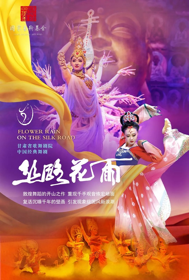 改革开放春风吹遍神州的1979年,民族舞剧《丝路花雨》创排首演,赢得了“此舞只应天上有,人间难得看几回”的美誉,一个新的舞种“敦煌舞”也随即诞生,获原文化部“创作一等奖”和“演出一等奖”。1982年,同名彩色银幕艺术片拍摄,舞剧也于同年走出国门,成为亚洲第一个进入米兰斯卡拉歌剧院的演出团体,拉开了出访交流巡演的序幕。此后《丝路花雨》的足迹遍布40多个国家和地区,登上肯尼迪艺术中心、林肯艺术中心等顶尖艺术殿堂,深受海内外观众的喜爱和新闻媒体的热捧。2008年,经历了重新修排改版,《丝路花雨》作为北京奥运会重大文艺演出参演剧目,在北京天桥剧院连演五场,大获成功。2016年,为迎接首届丝绸之路(敦煌)国际文化博览会开幕式,作为首演剧目,邀请了国内优秀主创团队和著名青年演员,充分应用数字舞台技术的展现手法,对《丝路花雨》再次进行改版,展现出经典的无穷魅力。