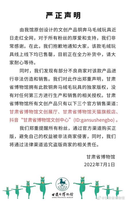 同时,甘肃省博物馆发现有部分不良商家对该款产品进行非法仿造和销售,并对此作出郑重声明:甘肃省博物馆拥有此款铜奔马绒毛玩具的独家版权,没有对任何第三方进行生产和销售的相关授权。甘肃省博物馆所有文创产品只有以下三个官方销售渠道:甘肃省博物馆文创展厅、甘肃省博物馆天猫旗舰店、抖音“甘肃省博物馆文创中心”(ID:gansushengbo)。