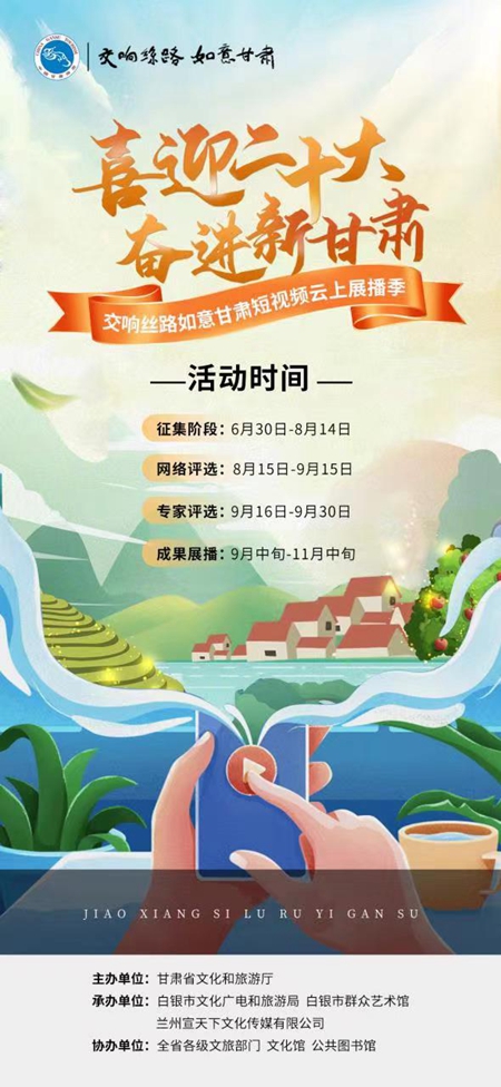 为讴歌伟大祖国的辉煌成绩,喜迎党的二十大胜利召开,增强爱国情感,弘扬民族文化,促进群众文化事业繁荣发展,近日,由甘肃省文化和旅游厅主办,白银市文化广电和旅游局、白银市群众艺术馆承办的“喜迎二十大 奋进新甘肃”——“交响丝路·如意甘肃”短视频云上展播季活动正式启动。