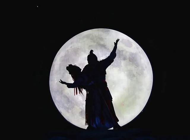 剧中,过家门而不入的大禹在门外与其妻涂娇展开心灵对唱时,二人屋里屋外同步“侧身摇晃”,于从容间自然地外化了夫妻二人彼时彼景下的“心心相印”,也为观众带来载歌载舞的唯美享受,同时,也为陇剧传统表演程式打开了艺术的想象空间。此外,传统陇剧当中皮影的表现手法,也在《大禹治水》中大禹与涂娇的新婚场景妙借化用,给观众带来了古朴浪漫的视觉冲击。上古月夜,皎皎圆月中,一对新人互诉衷情的剪影形体,动静相宜,传情达意。