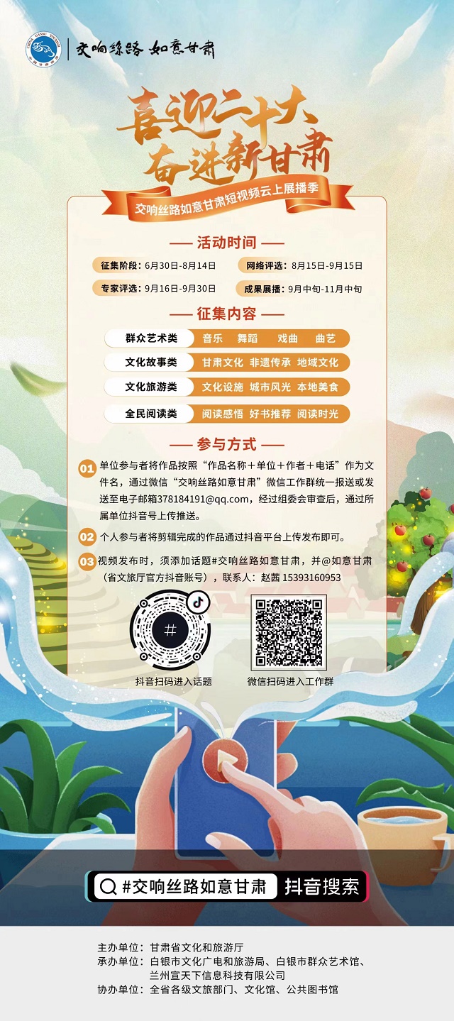 “喜迎二十大 奋进新甘肃”——“交响丝路·如意甘肃”短视频云上展播季活动主要面向全社会征集由群众自编、自导、自演、自主拍摄制作的短视频、微纪录片,通过短视频创作、征集、评选和展播活动,全平台呈现甘肃文化和旅游品牌形象,用短视频的形式讲好甘肃故事,传播好甘肃声音,弘扬社会主义核心价值观。