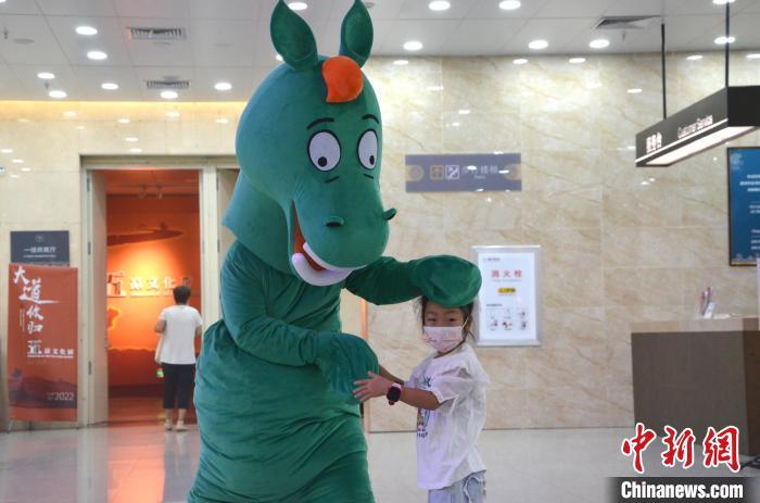 8月17日,在甘肃省博物馆内小朋友正在和真人版“铜奔马毛绒玩偶”互动。李亚龙 摄