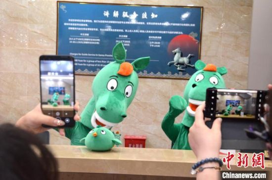 8月17日,真人版“铜奔马毛绒玩偶”在甘肃省博物馆工作台与游客互动。李亚龙 摄