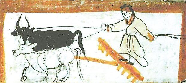 二牛抬杠图 出自嘉峪关魏晋墓砖画