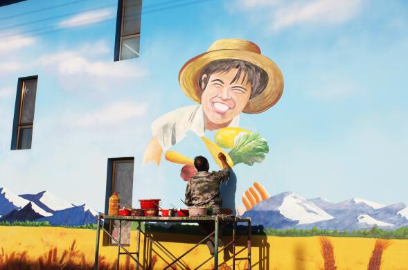 午后的阳光明晃晃地打在肃州区泉湖镇沙滩村5组村民的小别墅上,30岁的王玺珺带领57岁的李学信、58岁的陆兴保、41岁的盛强和20岁的大学生赵飞,在墙上聚精会神地画着《丰收的喜悦》。不一会儿,一个头戴草帽、怀抱盛满蔬菜瓜果篮子开心大笑的青年农民形象跃然墙上。在青年身后,有雪白的祁连山、金黄的麦田和排列整齐的温室大棚,这是泉湖镇的特色,是画师们应村民的要求增添的元素,因为许多村民通过种植温室大棚过上了好日子。