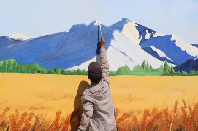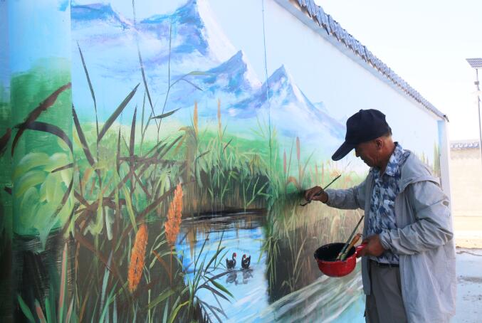 与这幅《丰收的喜悦》“隔路相望”的是他们刚刚完工的另一幅彩绘画,村民一眼认出它是家门口的“四坝海子”,现在叫天马湖。