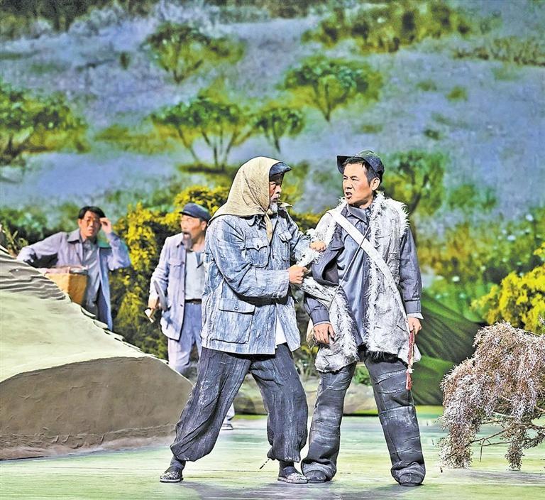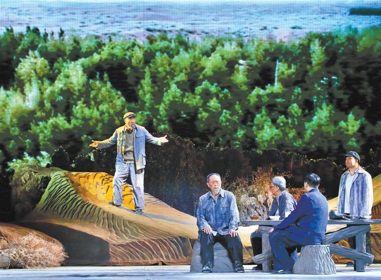 现实题材是话剧艺术的宠儿,在话剧进入中国一百多年的时光中,现实题材创作占据相当大的比例。在近当代中国历史的进程中,话剧始终起着敢为天下先、针砭时弊的作用,但话剧又有其极其特殊的艺术框范。人们在观看话剧时,仿佛就是在观看自己的人生,观看自己和身边最熟悉的人们,这是话剧艺术独具的极高的审美要求。尤其是现代题材的创作,稍有不慎便会陷入同质化的僵硬模式,使舞台艺术失去应有的美感。话剧《八步沙》让6个老汉成为舞台聚光灯下的主角,体现了创作者们呼应时代之需,为最普通的农民写生立传的拳拳之心。6个老农民谈不上人们通常意识中的“美”,“治沙”这样的故事也相对比较单调,不大容易出彩,而创作者们以八步沙这个真实的地名作为剧名,以“六老汉”治沙这个真实的事件作为全剧的叙述内容,却能宕开一笔把特定的外部环境与人物的内心世界巧妙地融为一体,为全剧注入了浓郁饱满的戏剧情境和情感,使这部话剧有了独属于自己的一份力度、一份无法替代的光彩。全剧的情节一曲三折,以小见大,当黑压压的沙尘暴铺天而来的时候,当六老汉在严酷的环境中吃尽苦头,摸索出“一棵树,一把草,压住沙子防风掏”的宝贵经验,使漫无边际的沙漠终于出现一抹绿色,继而眼看着一棵又一棵绿树成活成林,终于成为一片绿洲的时候,我相信观众的心也被艺术琴弦拨动,始终被剧情牵着走,为剧中人物的命运担心、悬心、痛心、开心,从中深深地感受到剧中所蕴藏的丰富内涵和它所传达出的真切意趣。