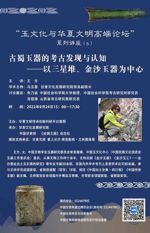 中国甘肃网9月6日讯 (本网记者 刘姗)由西北师范大学华夏文明传承创新科研平台集群主办,甘肃文化发展研究院、中国甘肃网、《丝绸之路》杂志社联合承办的“玉文化与华夏文明高端论坛”第五讲《古蜀玉器的考古发现与认知——以三星堆、金沙玉器为中心》,将于2022年9月24日15:00—17:30在线上举办。届时,中国甘肃网将通过腾讯会议(会议号:552447905)、官方抖音账号及微信视频号进行直播。