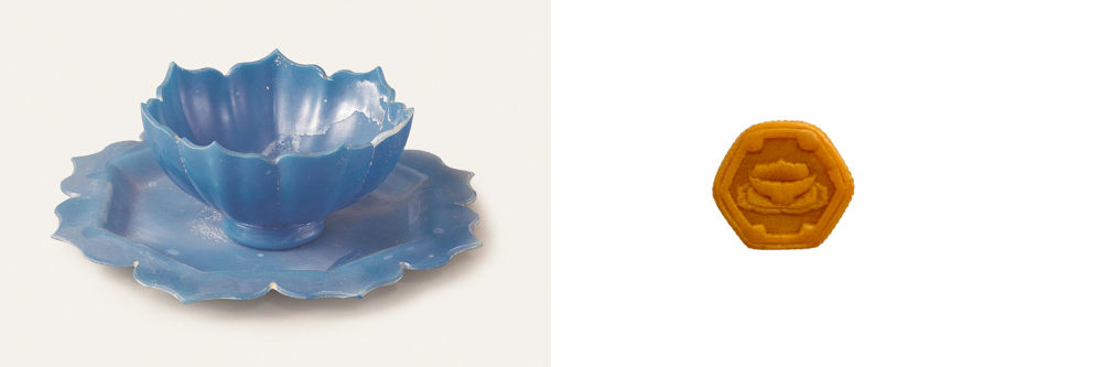 拼版图片:左图为莲花形玻璃托盏文物图片;右图为甘肃省博物馆根据莲花形玻璃托盏创作的杨枝甘露拉丝月饼。莲花形玻璃托盏是出土于甘肃省定西市漳县汪世显家族墓的元代文物,托盏为半透明玻璃质地,造型华美,完整成套,是中国古代玻璃制品的瑰宝。(甘肃省博物馆供图)
