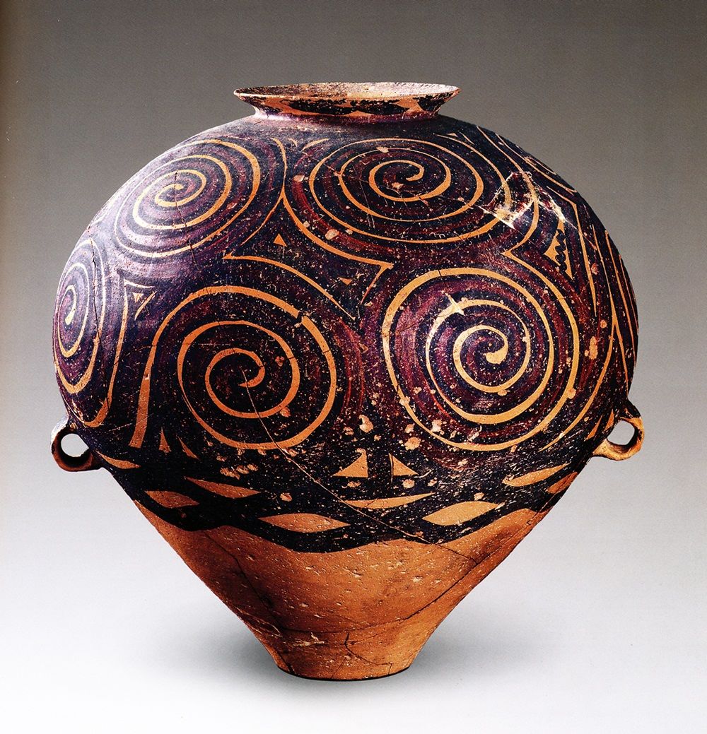 图为甘肃省兰州市永登县蒋家坪遗址出土的文物涡纹彩陶瓮,属马家窑文化马厂类型,距今约4000年,享有“彩陶王”的美誉。(甘肃省博物馆供图)