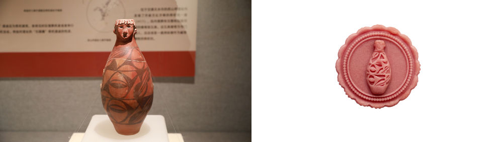 拼版图片:左图为6月11日在甘肃省博物馆拍摄的人头形器口彩陶瓶复制品(新华社记者 何问 摄);右图为甘肃省博物馆根据人头形器口彩陶瓶创作的奶酪红酒蔓越莓月饼(甘肃省博物馆供图)。人头形器口彩陶瓶出土于甘肃省天水市秦安县大地湾遗址,属仰韶文化庙底沟类型,距今约5500年,器口为圆雕头像,五官端正,瓶身施黑彩,每层图案分为两部分。
