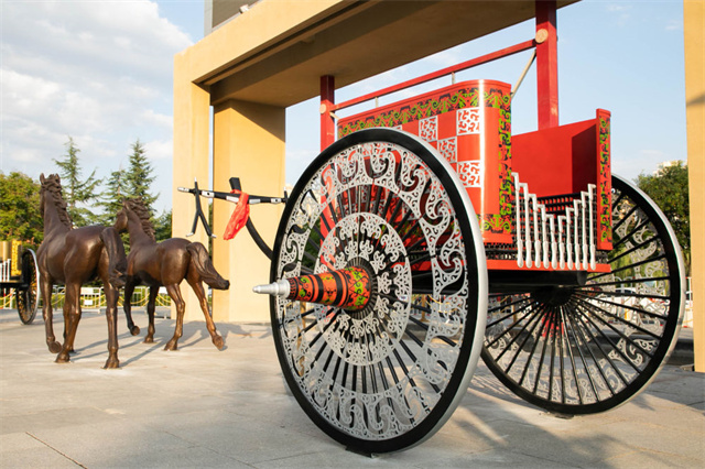 据介绍,本次展陈的4组战国马车复制品长3.56米,高1.78米,重达2吨。车身和金属装饰片采用古法铜雕技艺,经过30多道工序铸造而成,车辆表面使用高级金属漆手工绘制精美纹饰图案,生动再现了战国戎人车马风采。