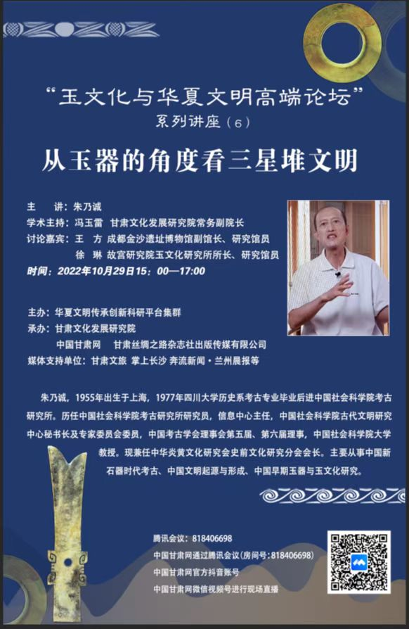 中国甘肃网10月10日讯 由西北师范大学华夏文明传承创新科研平台集群主办,甘肃文化发展研究院、中国甘肃网、甘肃丝绸之路杂志社出版传媒有限公司承办的“玉文化与华夏文明高端论坛”系列讲座第六讲《从玉器的角度看三星堆文明》将于2022年10月29日15:00—17:00举办。中国社会科学院考古研究所研究员朱乃诚主讲,玉学专家王方、徐琳担纲讨论嘉宾,甘肃文化发展研究院常务副院长冯玉雷主持。
