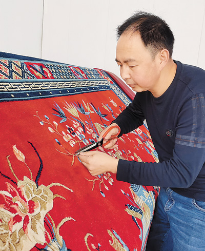 绘图、选毛、纺纱、织毯……从原料到成品,手工制作一张地毯要历经10余道工序。作为临夏手工地毯制作技艺非遗传承人,41岁的梁俊始终坚持传承老手艺。