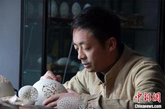 “甘肃省技能大师工作室”领办人杨星国从事蛋雕技艺十余年,精雕细琢毫厘之功。(资料图) 受访人供图