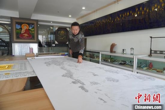 李海明展示作品《龙楼凤阁迎盛世》底稿。 九美旦增 摄