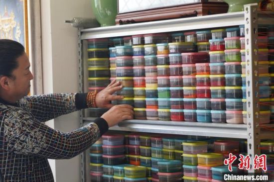 李海明在工作室内选取制作珐琅画的颜料。 九美旦增 摄