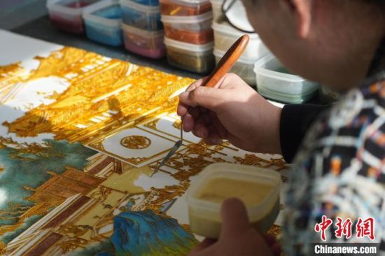 12月6日,甘肃兰州,画师李海明在工作室内精心制作掐丝珐琅画。 九美旦增 摄