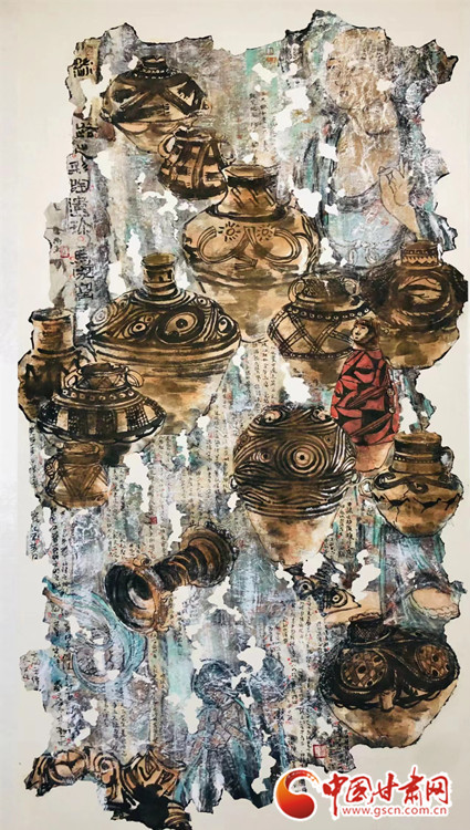 他的这幅作品《丝路遗珍-马家窑》于2018年获甘肃美术专业最高奖“金驼奖”,采用黄河的“s”型构图展开,将八千年前新石器时代大地湾文化、马家窑文化的经典代表器物分次展开。作品左上角及中间部分依次叠加,穿插,绘制中与敦煌文化中的壁画、飞天、佛像有机结合,寓示丝路文化有序传承、源远流长,又对画面的视觉拨高提升。
